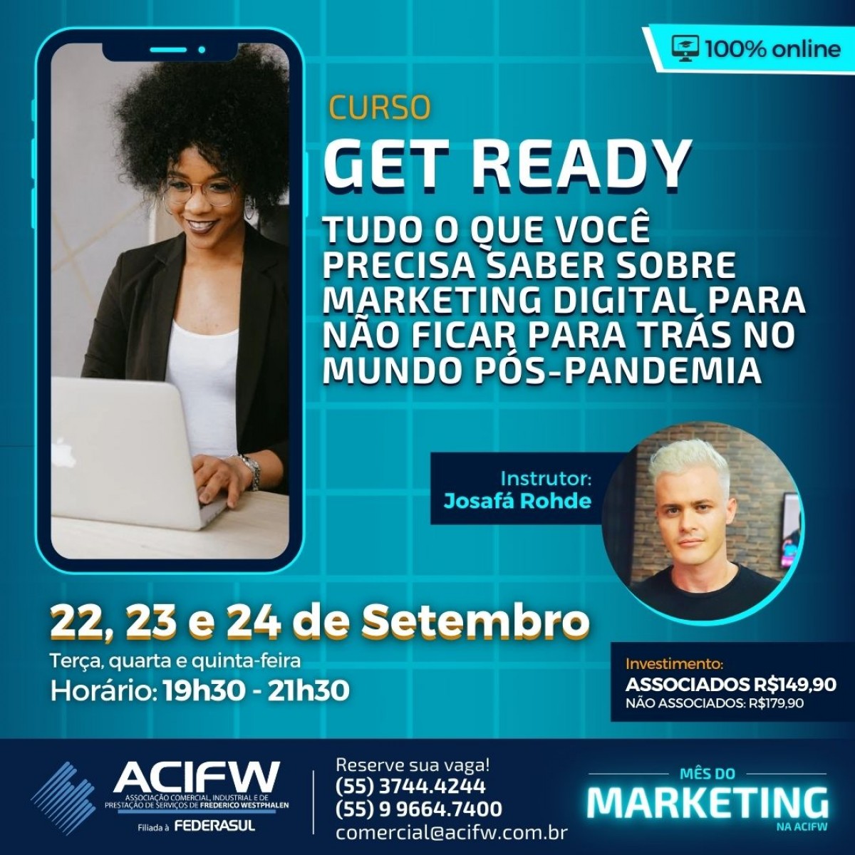 Pensando nisso, a ACIFW irá promover um curso 100% online sobre Marketing Digital entre os dias 22, 23 e 24 de Setembro. A capacitação “Get Ready – Tudo o que você precisa saber sobre Marketing Digital para não ficar para trás no mundo pós-pandemia”, será realizada a noite, das 19h30 às 21h30, via link para reunião online.