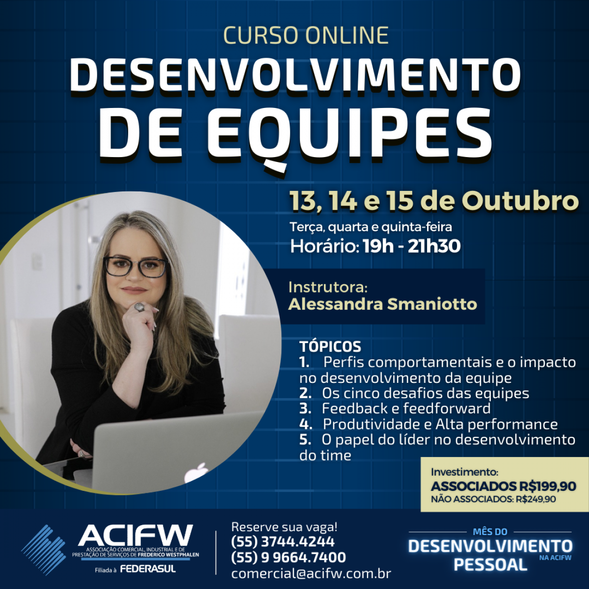 O curso será realizado nos dias 13, 14 e 15 de outubro, das 19h às 21h30, através de aula ao vivo realizada por videoconferência. A capacitação tem vagas limitadas e o investimento é de R$199,90 para funcionários e proprietários de empresas associadas da ACIFW e R$249,90 para público geral.