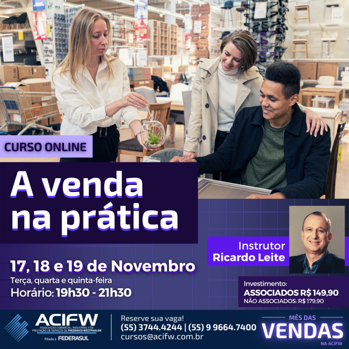 A Associação Comercial, Indústrial e de Prestação de Serviço de Frederico Westphalen (ACIFW) realizará nos dias 17, 18 e 19 de novembro o curso on-line “A venda na Prática”, que será ministrado por Ricardo Leite e faz parte da programação do Mês das Vendas, promovido pela entidade.
