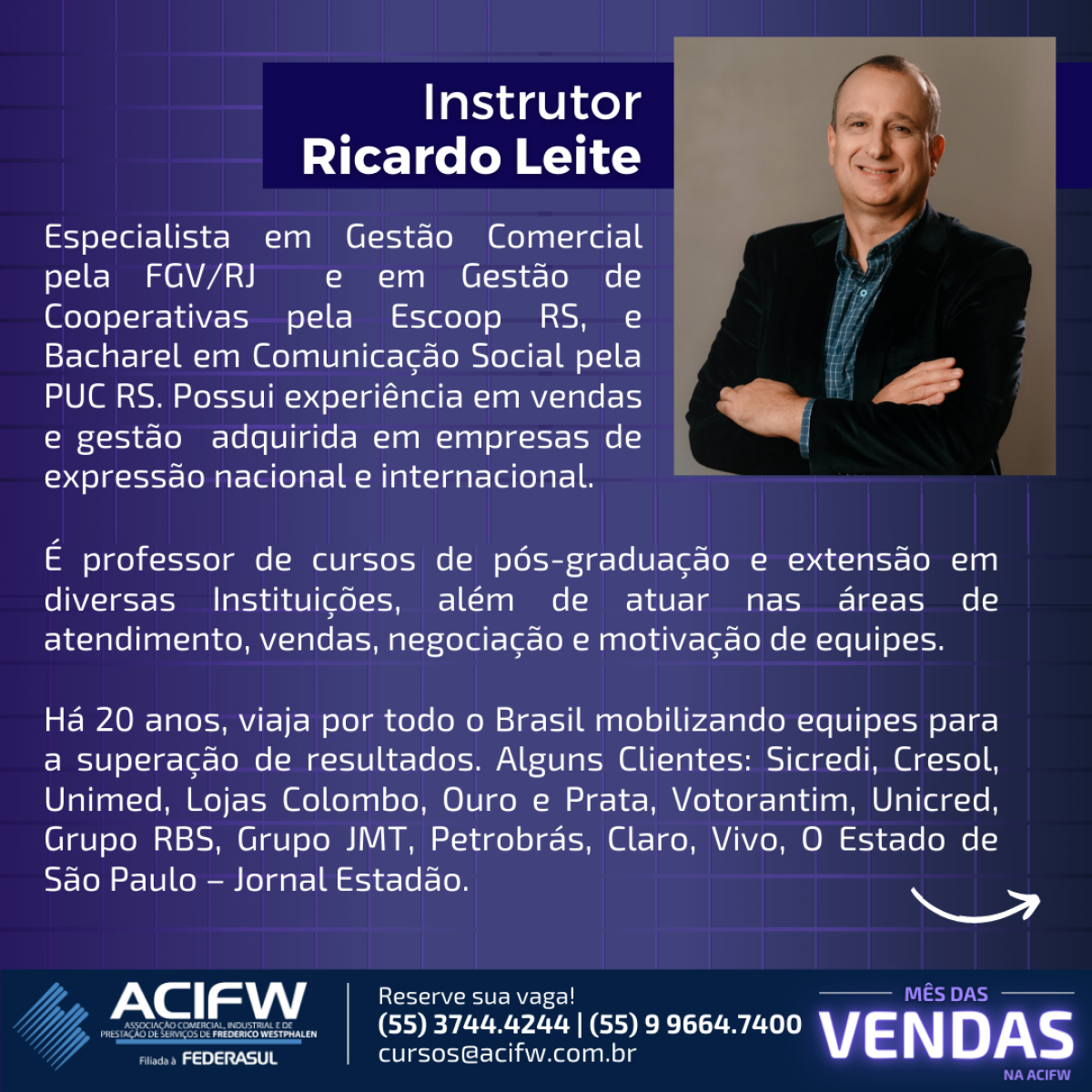 Ricardo Leite é especialista em Gestão Comercial pela Fundação Getúlio Vargas (FGV/RJ) e em Gestão de Cooperativas pela Faculdade de Tecnologia do Cooperativismo do Rio Grande do Sul (Escoop/RS). É professor de cursos de pós-graduação e extensão em diversas instituições, além de atuar nas áreas de atendimento, vendas, negociação e motivação de equipes. Há mais de 20 anos, Ricardo viaja por todo o Brasil desenvolvendo equipes em grandes empresas como a Sicredi, Cresol, Unimed, Votorantim, Grupo RBS, Petrobrás, entre outros.