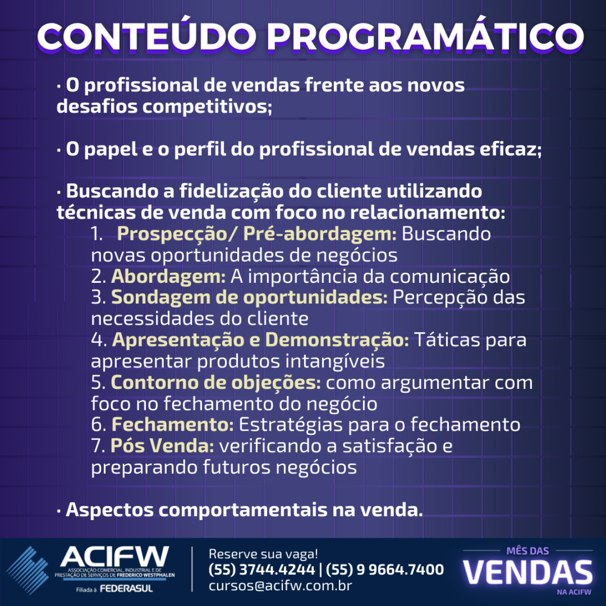 A capacitação acontecerá das 19h30 às 21h30 e é aberto para todos os públicos. Associados da ACIFW têm desconto e condições especiais: R$149,90 para associados da entidade e R$179,90 para público geral. Para maiores informações e inscrições, contate a entidade pelo e-mail: comercial@acifw.com.br ou pelos telefones: (55) 3744-4244 / (55) 9.9664-7400.