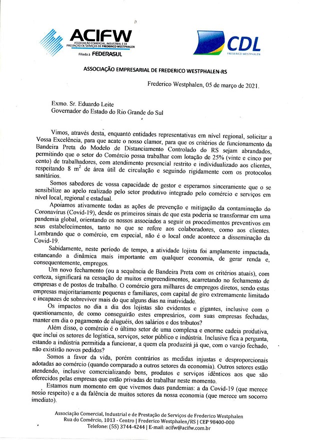 ?Entidades Empresariais pedem modificações na bandeira preta ao Governador do RS Eduardo Leite