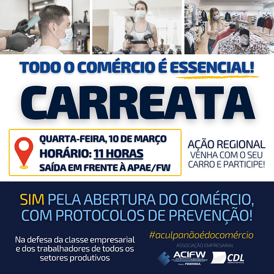 Com o slogan “Todo o comércio é essencial”, carreata será realizada na quarta-feira em 20 municípios da região.