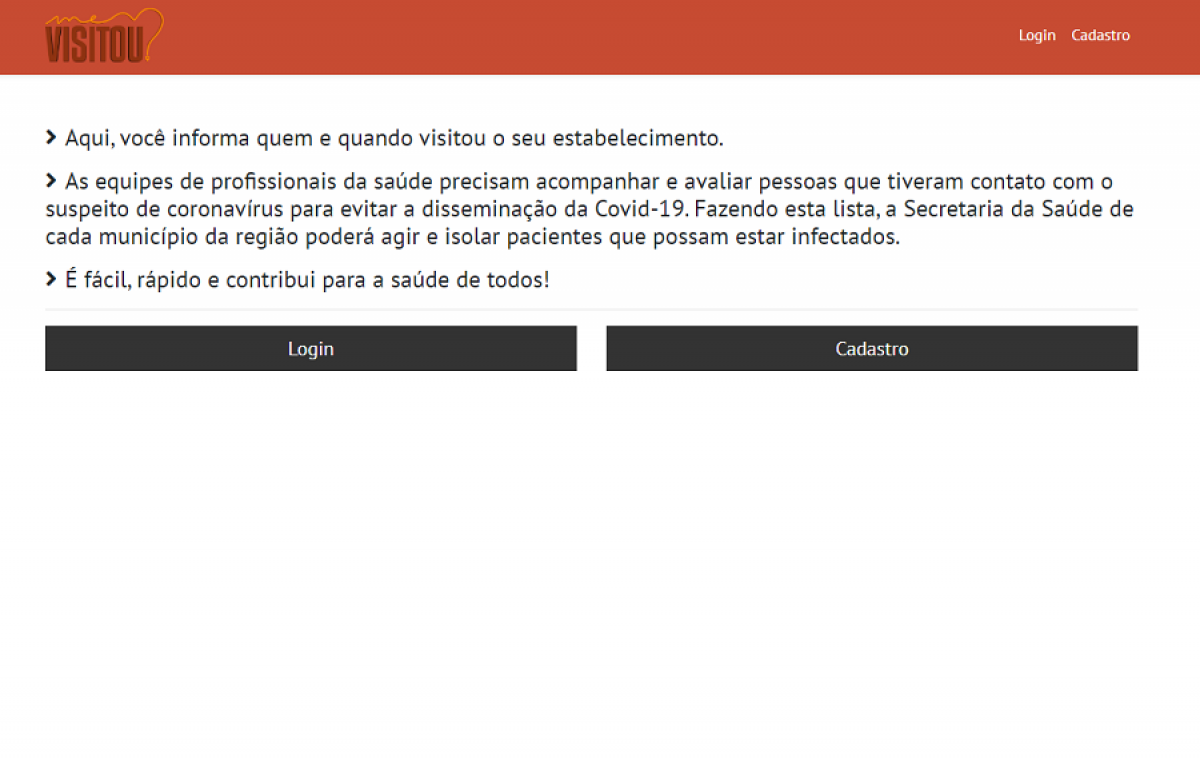 www.mevisitou.com.br tem como objetivo facilitar o cadastro de clientes para que as equipes de saúde possam acompanhar a movimentação de pessoas no município